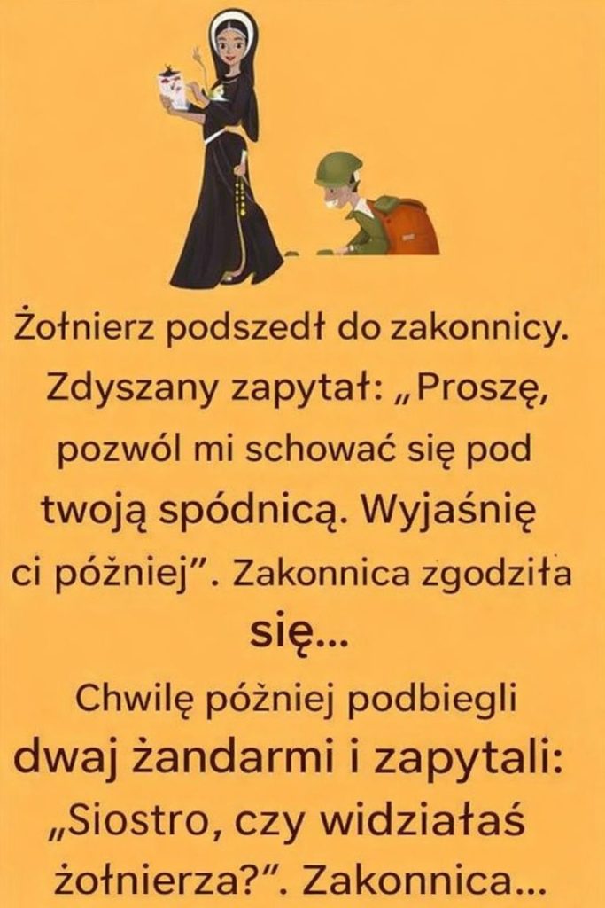 Zmęczony żołnierz, zdyszany, podszedł do życzliwej zakonnicy. „Proszę” – odpowiedział – „czy mogę schować się pod spódnicą? Później wszystko wyjaśnię”. Zakonnica, z litościwym sercem, następa się.